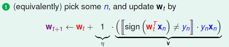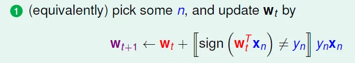 - 若有錯則更新,正確則不變($w^t = w^{t+1}$)