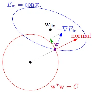 - 只找出在紅色圓(限制)內的最佳解,即紅色圓上與$W_{lin}$最近的點