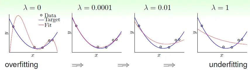 正規化用來減少hypothesis的complexity,避免overfit,用wTw作regulizer(L2),以λ為參數調整正規化的程度(即L2圓的大小,L1正方形的大小),通常λ不會太大