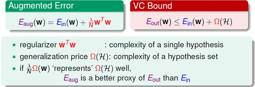 regularizer只限制單一hypothesis的complexity,不像VC bound整個hypothesis set都限制,所以Eaug比Ein更接近Eout