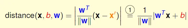 $distance(x_n, b, w) = (1/|w|) * y_n(w^t x_n + b)$ -- (2)