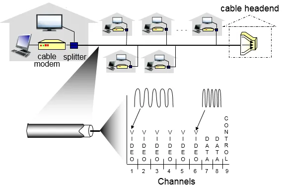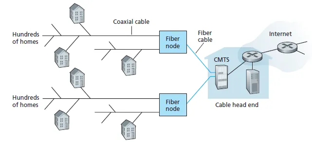 其主幹是光纖(Fiber)網路(fiber attaches homes to ISP router),末端枝幹是雙向同軸電纜線(Coaxial Cable)
