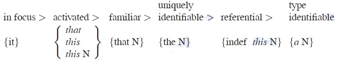 - Full name > long definite description > short definite description > last name> first name > distal demonstrative > proximate demonstrative > NP > stressed pronoun > unstressed pronoun